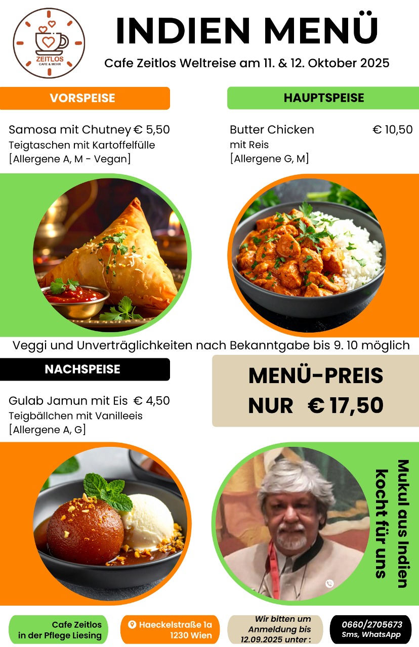 Da sich unser Café Zeitlos in einem Pflegeheim befindet, können einige unserer Stammkund:innen jedoch nicht so einfach verreisen. Als inklusives Café haben wir es uns deshalb zur Mission gemacht ihnen die ganze Welt ins Haus zu holen.Jeden Monat reisen wir kulinarisch in einen anderen Teil unserer Erde. Im Oktober geht es ins vielfältige Indien.